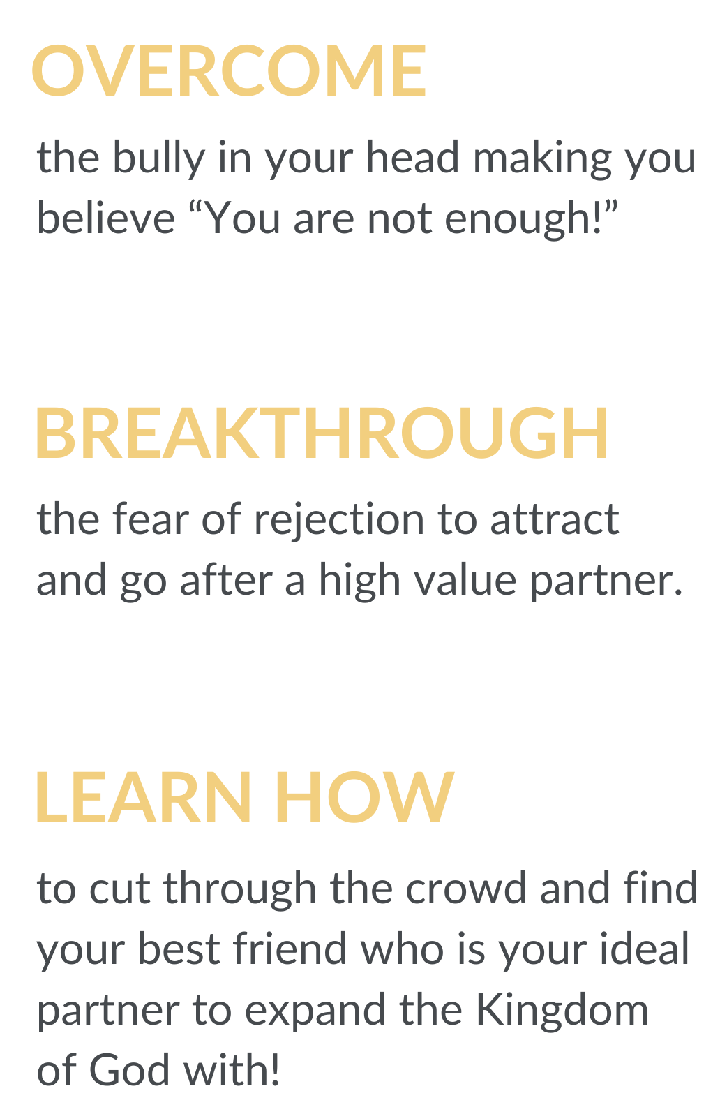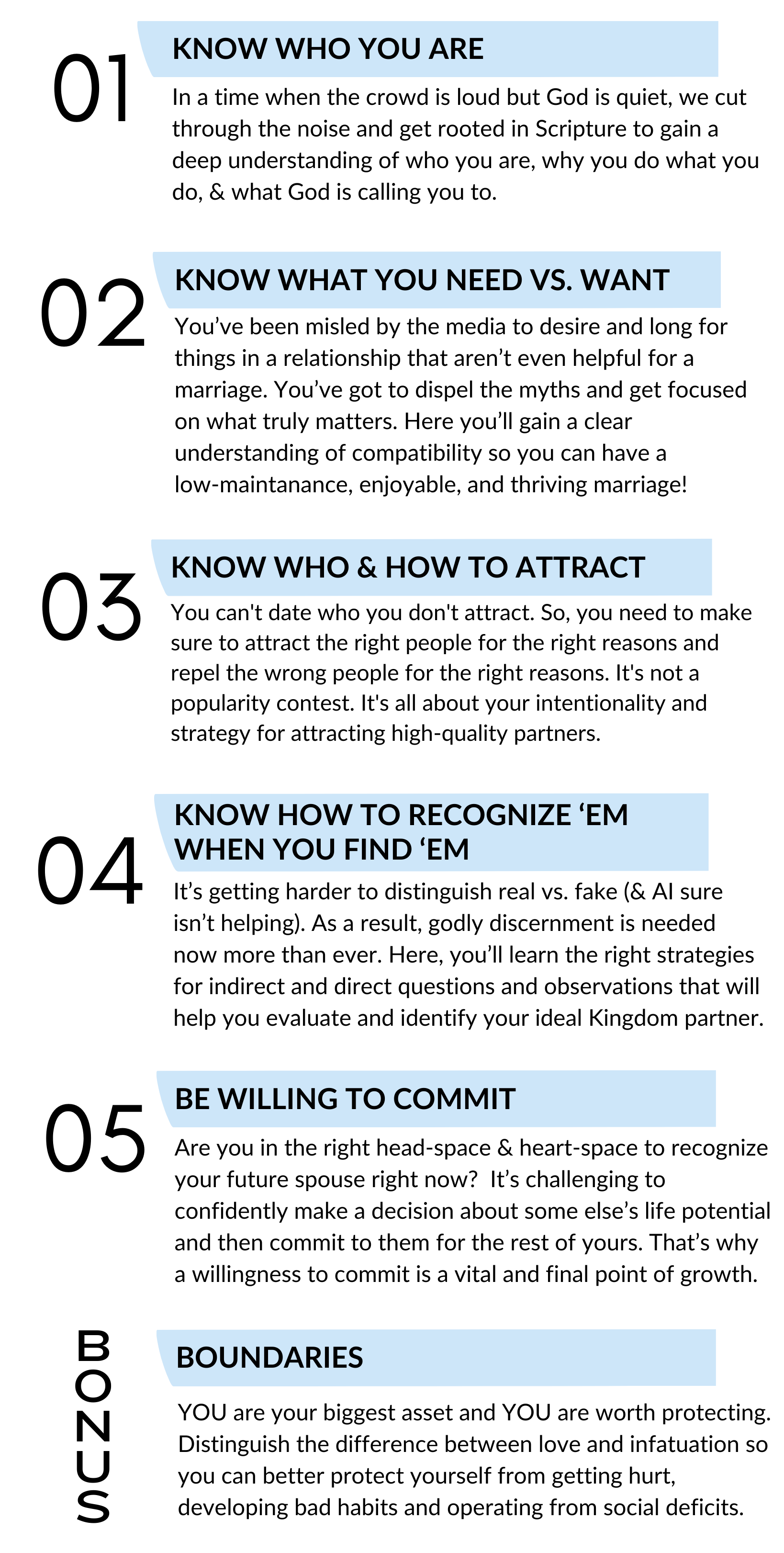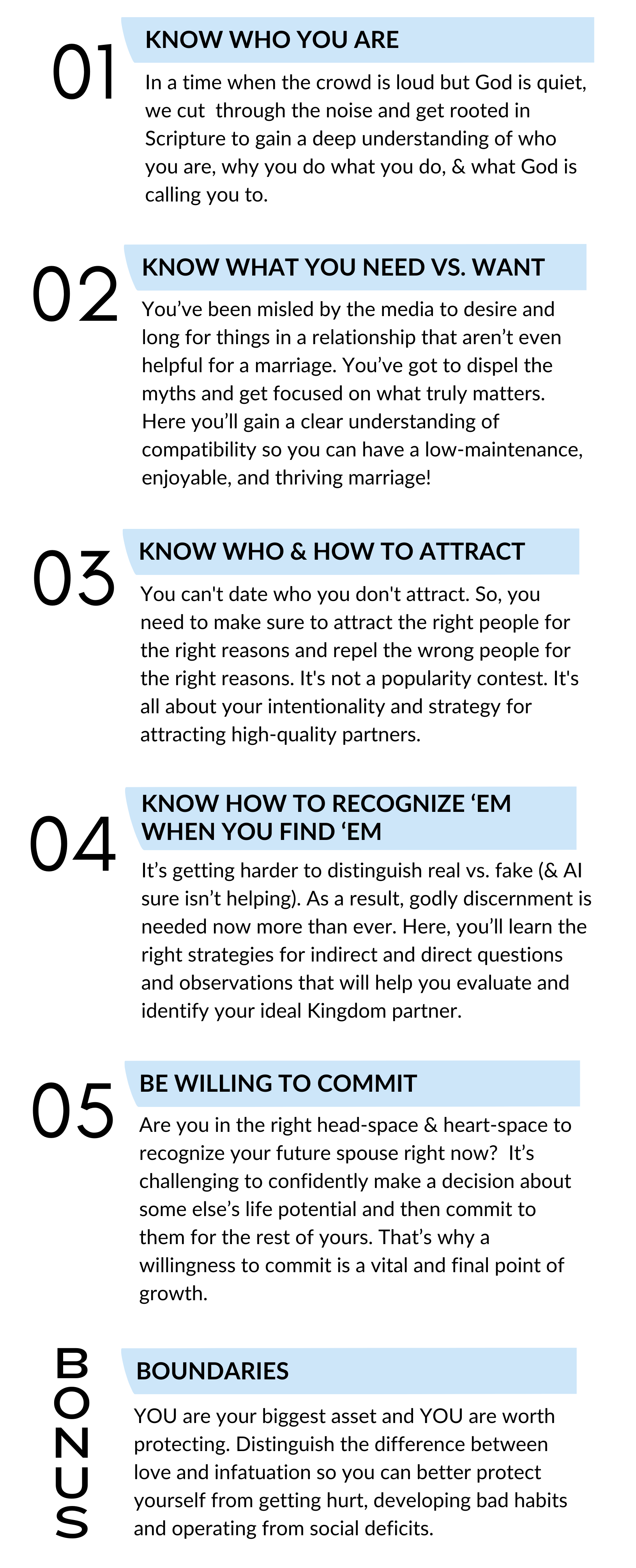 Unlike your endless feed of social media reels, shorts, and podcasts, Kingdom Coupling is a thoughtful, well-organized program, designed in such a way that one section builds upon another to give you a well-rounded, full, and comprehensive understanding so that you feel competent and confident in engaging in the sacred search for a godly spouse.